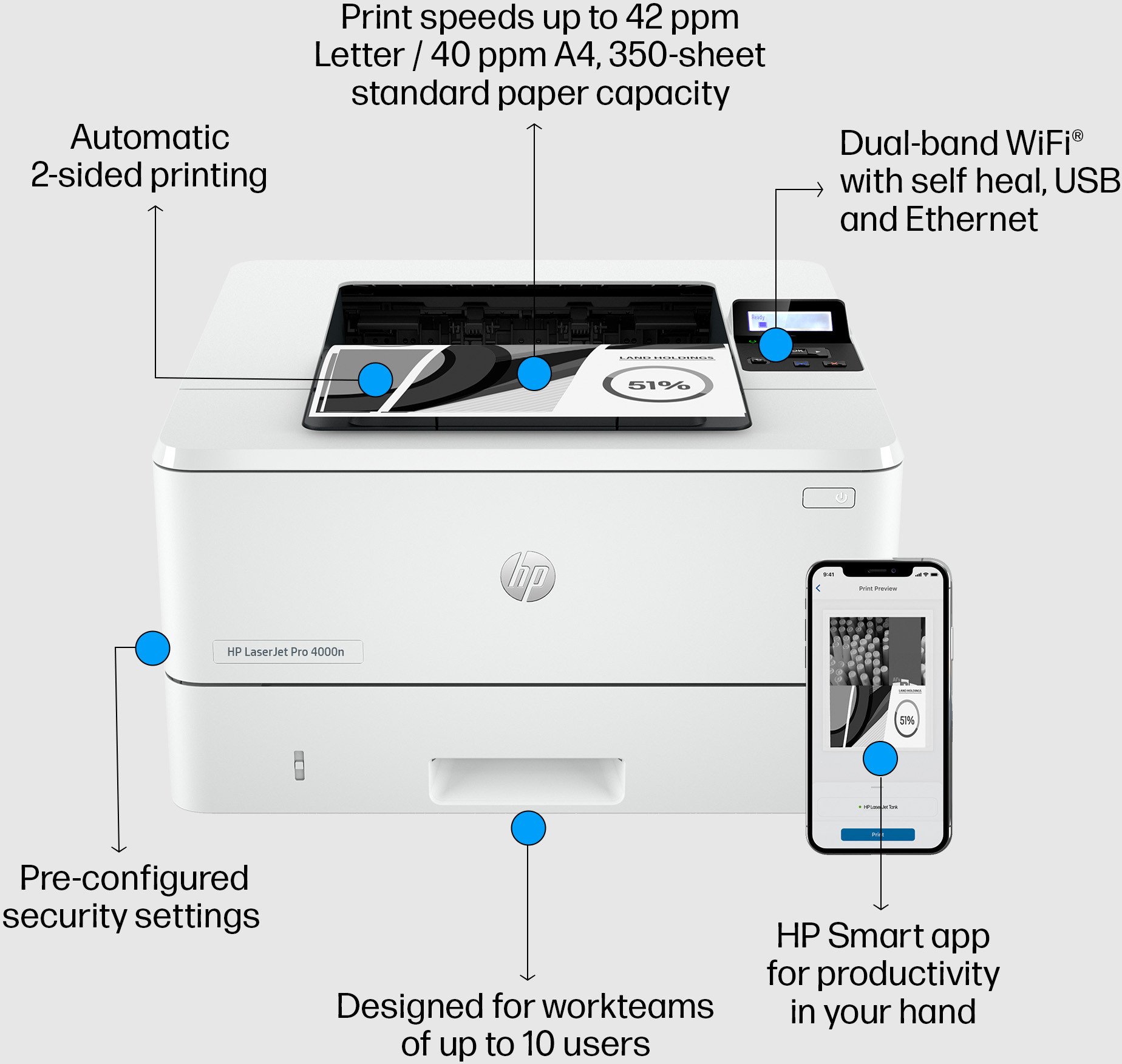 Vitesse d'impression noir: 40 pages par minute (norme ISO) Qualité d'impression noire: Lignes fines (1 200 x 1 200 ppp) Volume de pages mensuel recommandé: 750 à 4 000 (HP recommande un nombre de pages imprimées mensuelles dans la fourchette indiquée afin d'optimiser les performances du dispositif, en fonction de facteurs incluant les intervalles de remplacement des consommables et la durée de vie du dispositif durant la période de garantie étendue.)