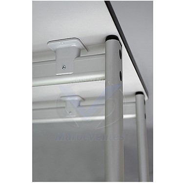 Table professionnelle multi-projection avec deux étagères pour le projecteur, l'ordinateur portable ou l'imprimante. Le dessus est en panneau de meuble de couleur grise. La base en aluminium argenté est mobile grâce aux roues verrouillables.ST007